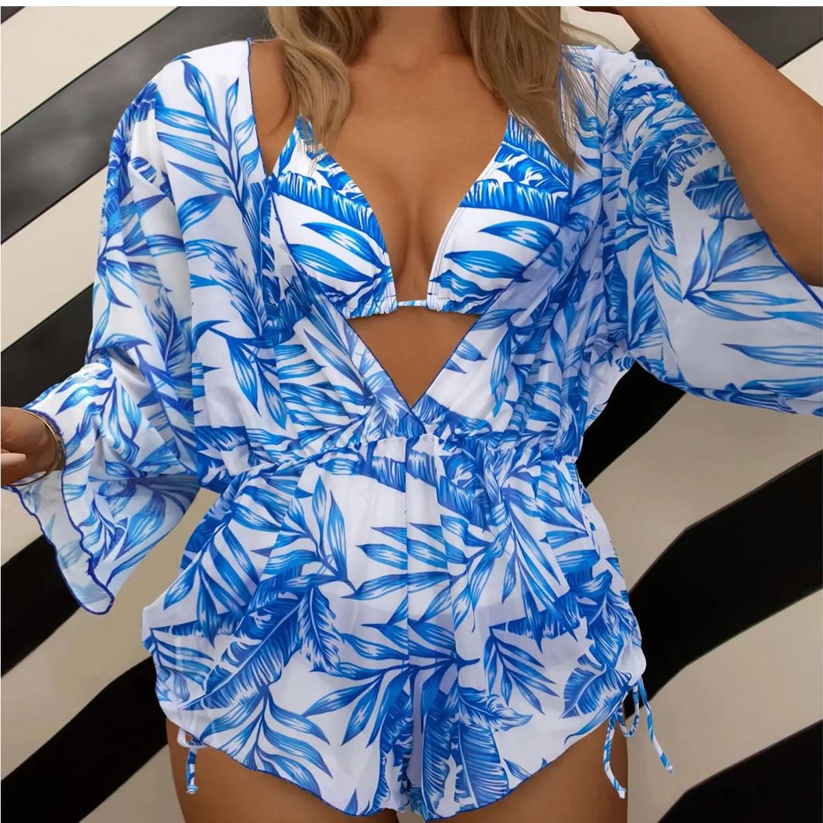 GJOB 2024 Seri Şık Havuz Başı Plaj Seti Deniz 3 Lü Set Medium Çiçekli Bikini Set Mavi